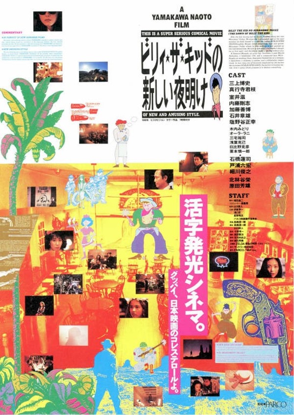 そんな空気を受けて登場した1986年公開の『ビリィ★ザ★キッドの新しい夜明け』。短編『パン屋襲撃』などの自主製作映画で注目された山川直人の初の商業用映画で、本作に出演している室井滋とは大学時代からの映画製作仲間でもある。脚本は『ジョン・レノン対火星人』をはじめとする高橋源一郎の小説を複数引用。高橋は脚本家としても本作に参加し、劇中にも一瞬、顔を見せる。