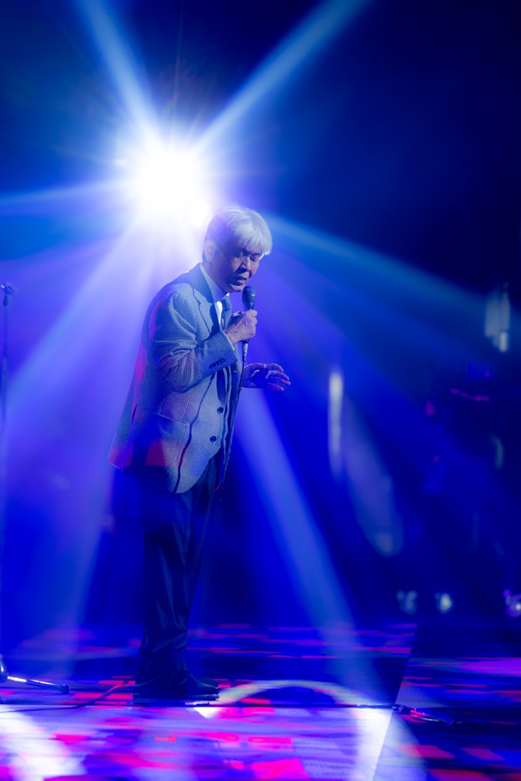 そして、スタンドマイクを前にして来生たかおが登場。来生はグレーのチェック柄ジャケットの3ピース姿という渋いスタイル。1曲目に歌われた「明日物語」は、ちょうど10年前、40周年記念のセルフカバーアルバム『夢のあとさき』に新曲として収録されていた楽曲である。